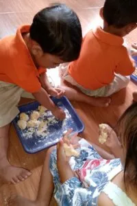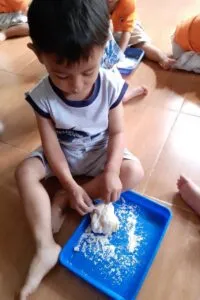 Melatih motorik anak bisa dengan berbagai cara, salah satunya dengan mengajak anak memasak bersama. Kali ini teman-teman di KB Melati praktek memasak bersama bu Asih. Bahan-bahan untuk memasak sudah di bagi masing-masing anak membawa dari rumah. Semua bahan di olah dan di proses bersama-sama di sekolah.