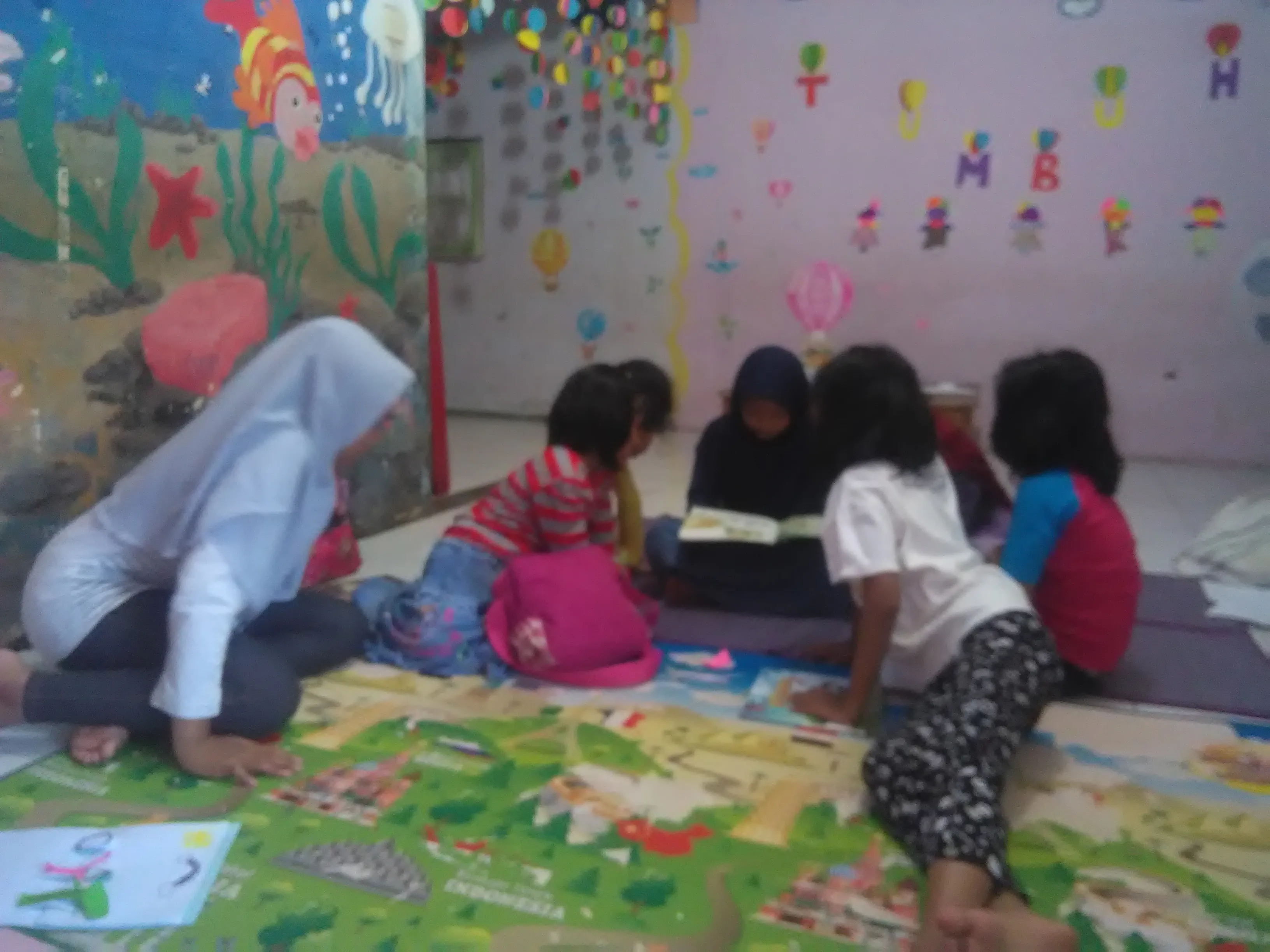Setelah itu anak-anak diajak membaca buku cerita dan mencerirakannya kembali, mereka dibebaskan memilih buku cerita yang akan dibaca maupun membawa buku cerita kesukaann dari rumah.