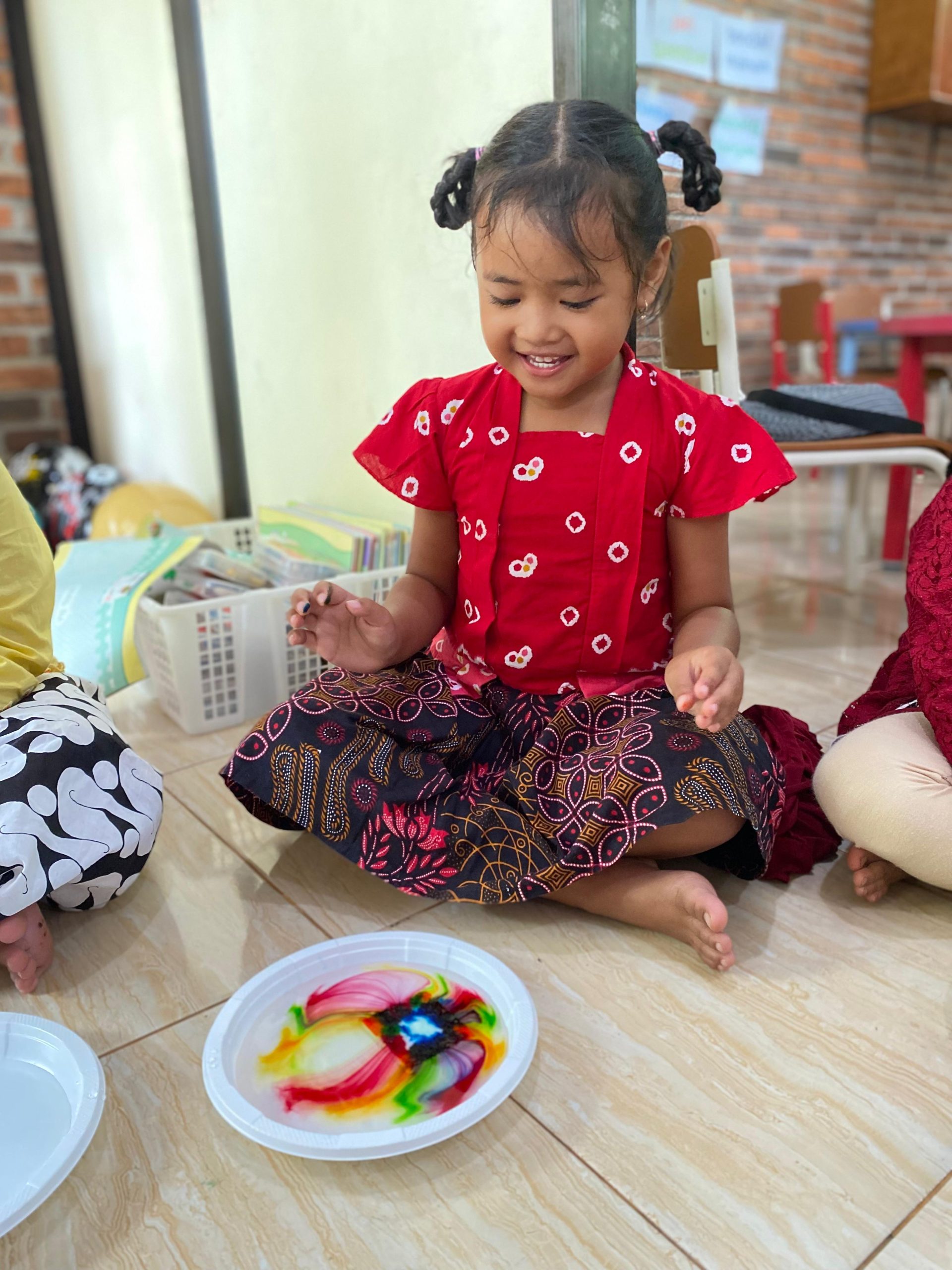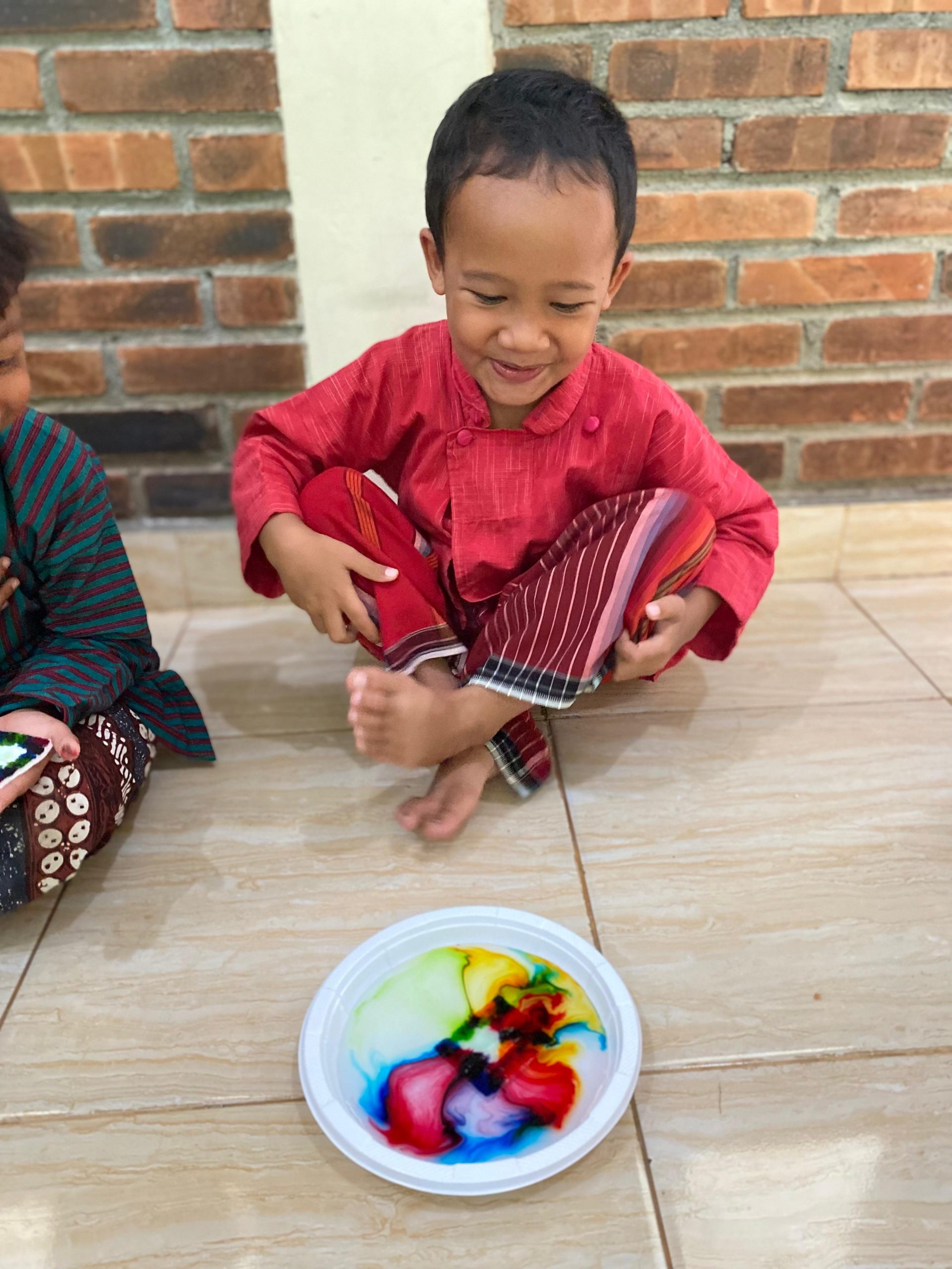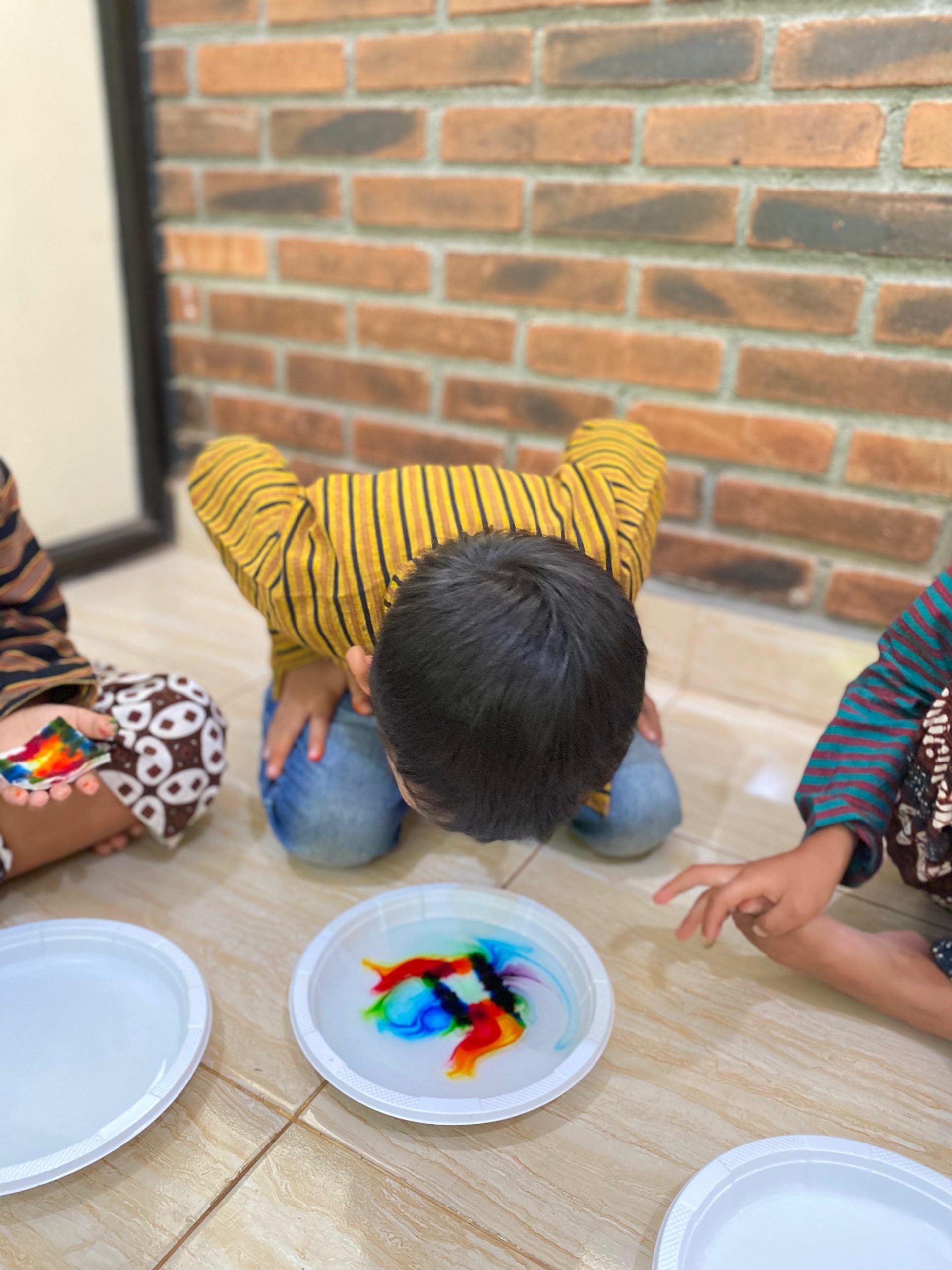 Kali ini teman-teman kecil di sekolah Rumahku Tumbuh sedang bermain percobaan membuat pelangi di air. Bahan-bahan yang digunakan yaitu pewarna makanan, kapas, air dan wadah untuk membuat pelangi. Teman-teman di sekolah rumahku tumbuh selalu antusias mengikuti kegiatan percobaan yang rutin diadakan di kelas, Teman-teman dengn sabar bergantian membuat percobaan ini, ibu guru mendampingi dan memberikan bantuan kepada teman-teman yang kesulitan. Manfaat yang didapat dengan mengajak anak melakukan percobaan sains sederhana yaitu dapat meningkatkan rasa ingin tahu anak,sehingga meningkatkan kemauan dan semangat anak untuk belajar.