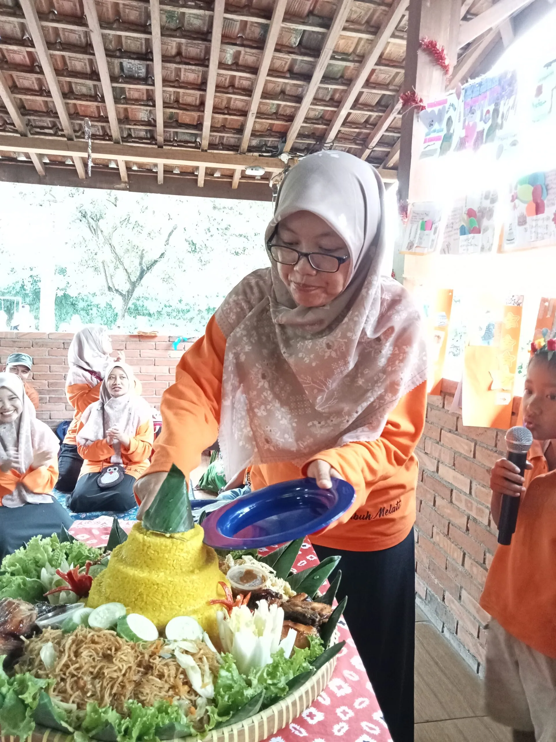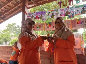 berdoa dan potong tumpeng yang diserahkan ibu Septiyati kepada ibu Ambar sebagai kepala sekolah TK Rmahku Tumbuh.
